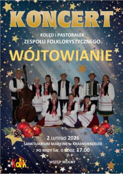 Krasnobrodzki Dom Kultury serdecznie zaprasza na koncert kolęd i pastorałek w wykonaniu zespołu folklorystycznego „Wójtowianie”, który odbędzie się w Sanktuarium Maryjnym w Krasnobrodzie 2 lutego 2026 r. po mszy świętej o godzinie 17.00